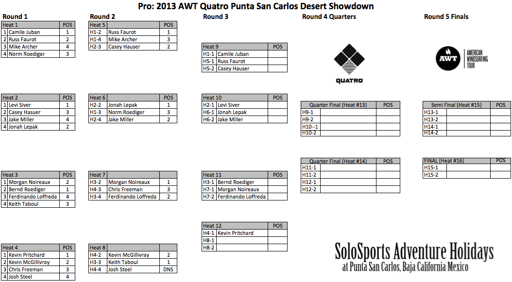 The masters division was also able to pump through every heat except for the final. Advancing from round 2 Jamie Crowley and Mike Colee from one heat. From the other heat Marty Rosse (despite sailing with stitches in his foot from the previous day) and Eric Sinclair also advanced. The third round saw Norm Roediger and Marty Rosse advance as well as Ferdinando Loffreda and Mike Colee advance to the semi-final. Marty Rosse and Mike Colee with both continuing their solid performances. Roediger who patiently picked off the best set waves to score the most points took the semi-final. But Loffreda also advanced setting up and epic head-to-head final in the masters division!